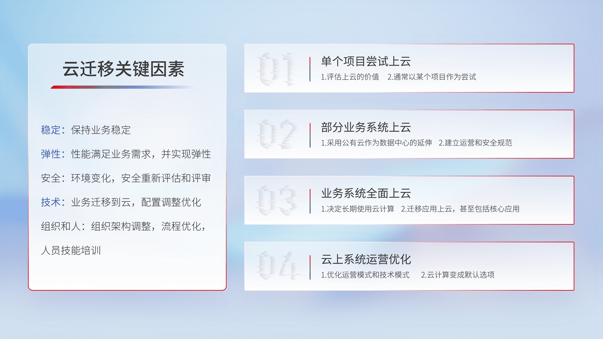 结合实际业务,,,从规划设计、、、云平台选型、、、、云原生改造、、数据迁移、、、、集成交付,,迁移全过程为客户识别最佳上云路径,,,做好风险识别管理,,,设计网络架构、、、、身份权限、、安全审计合规、、、、操作审计、、、日志审计、、监控告警策略、、多站点容灾设计等,,,,对云上基础设施进行整体规划,,,提升IT治理水平,,,以满足弹性、、、、高可用、、、高性能的需求。。。