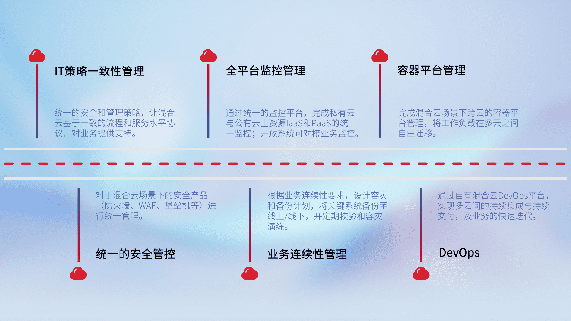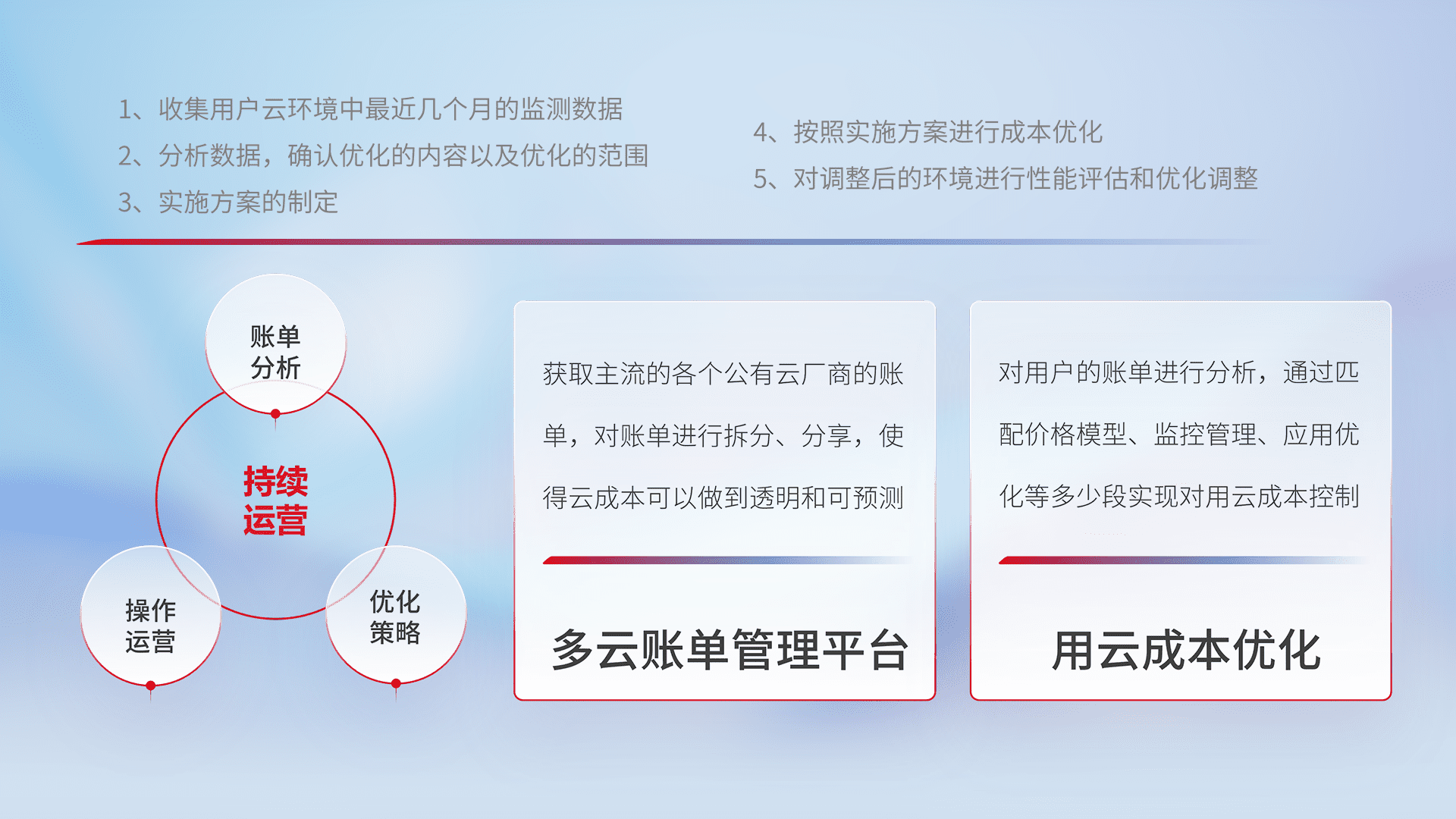 通过多云纳管,,以统一的资源数据模型把客户的云资源进行抽象和封装,,进而实现对多云资源的统一操作,,,保障云资源管理的可靠性、、、稳定性与可用性。。量身定制化运维内容,,配置、、、开发运维、、补丁管理、、、备份、、、监控、、、、认证和访问管理、、审计和日常巡检等,,,,保障在用云过程中的可靠度,,稳定度以及高可用率。。。。