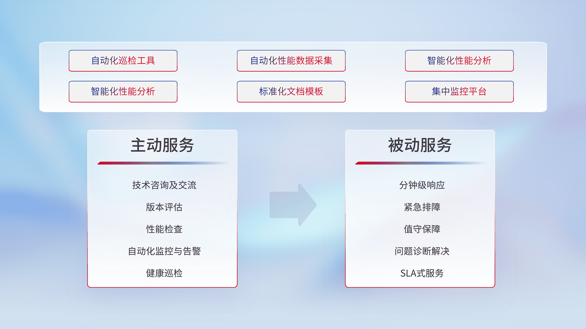 智能化工具和标准化文档,,保障服务质量,,,,提供主动服务(包含技术咨询、、、、版本评估、、、、性能检查、、自动化监控与告警、、、健康巡检)和被动服务包含(分钟级响应、、、紧急排障、、、、值守保障、、问题诊断解决、、、SLA服务)。。
