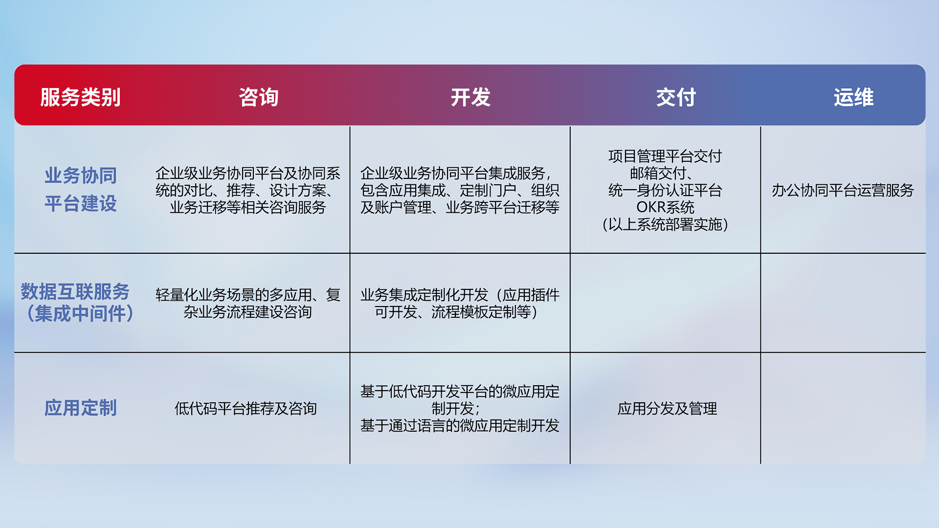 针对钉钉、、企微、、、IDaas等平台级产品提供产品的规划、、、方案、、交付、、、、定制化开发等服务,,,实现如统一协同办公、、、智能客户服务、、、混合会议管理、、、智能数据查询、、、、等业务场景,,实现数字化转型。。。。